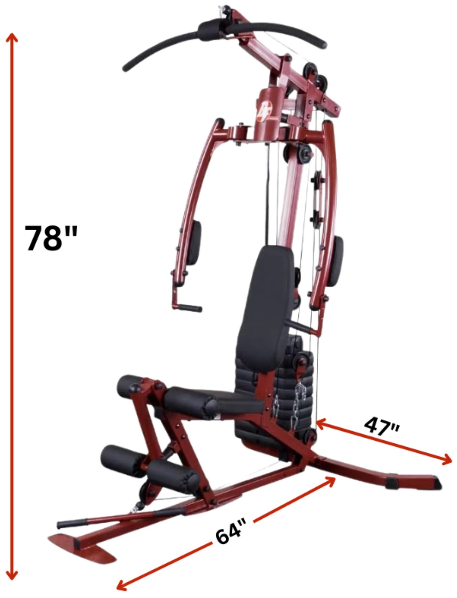 Complete gym in one compact, affordable machine. The padded pressing arms follow the natural arc of a free weight bench press and pectoral dumbbell fly. Features 2200 lb. test nylon coated aircraft quality cables and fiberglass pulleys with ball bearing movement on solid axle rotation. Includes high pulley with wide grip lat bar and low pulley with narrow grip low row bar. No cable change design! Exercises include: bench press, pectoral fly, front/back lat pulldown, tricep pressdown, leg extension / leg curl, tricep extension, low pulley station (curls, seated row, shrugs, oblique bends, upright rows, bent over rows, adduction, abduction, front/side deltoid raises).