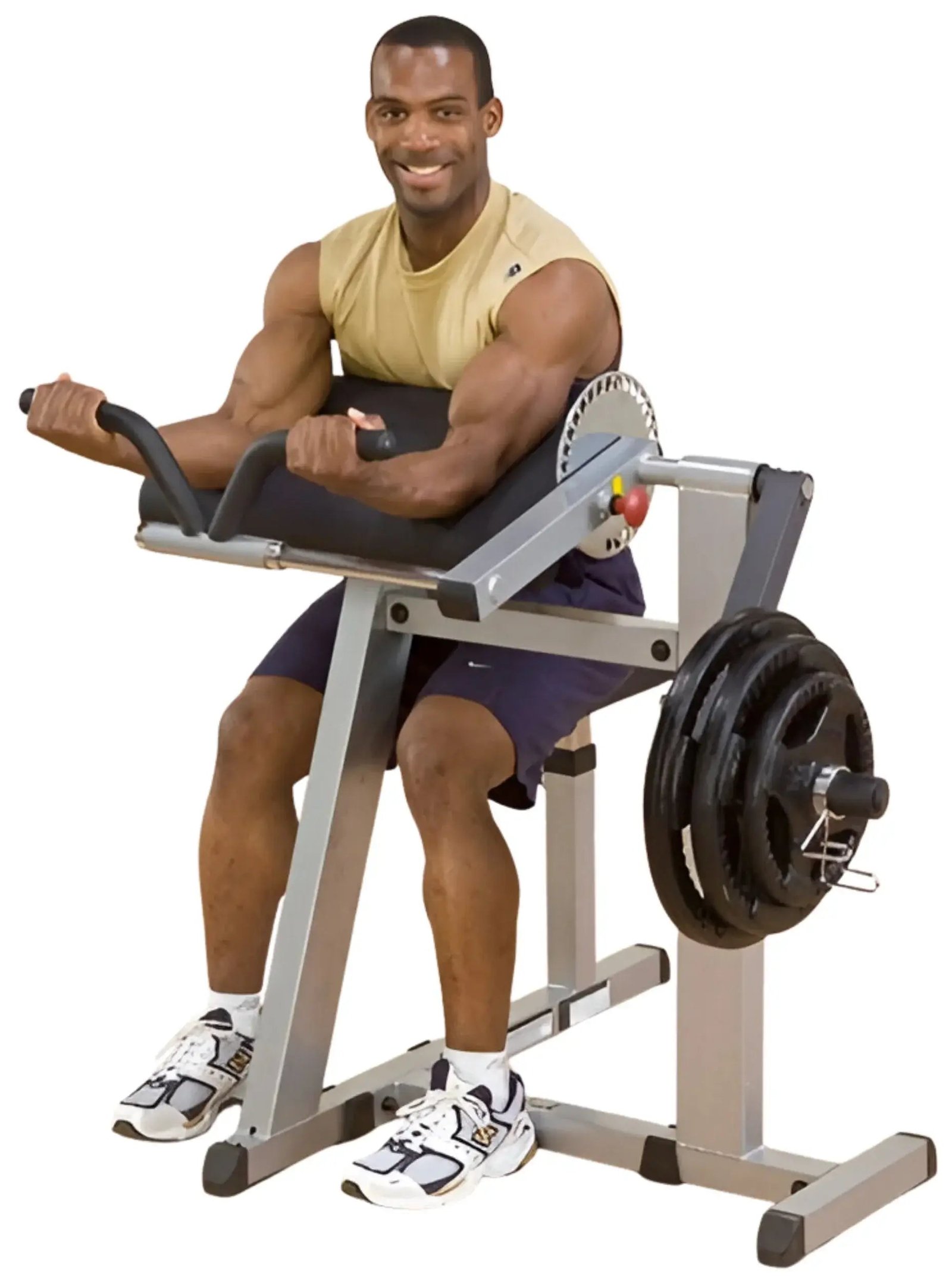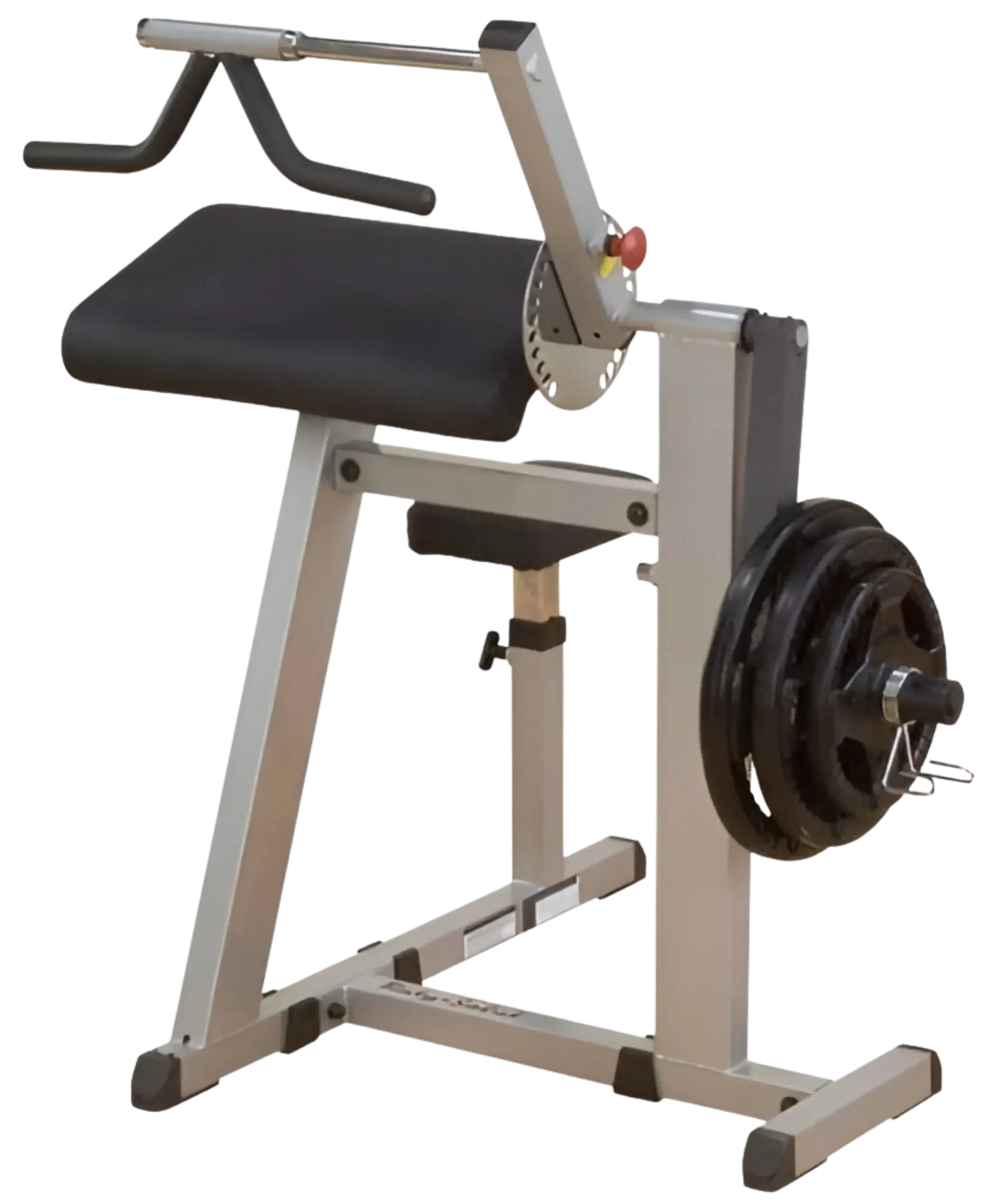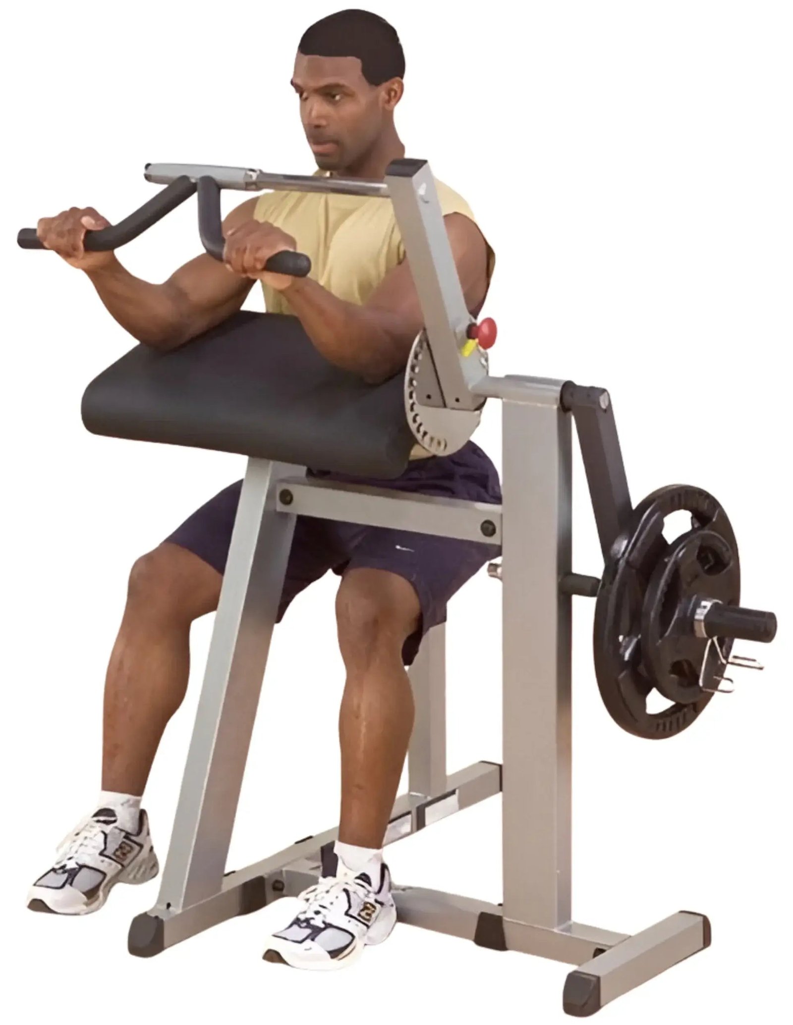 Bulging biceps and triceps are yours to develop with this intelligent dual-function design. Raise or lower the adjustable seat for proper positioning and then rest your arms on the over-stuffed support pad. Positioned at a 30® angle for precise biomechanical movement, the thoughtful combination of 2″ x 2″ and 2″ x 4″ supportive steel blends structural integrity with comfort. Pull the jumbo pop pin to lower the lifting arm and grab hold of the rotating v-bar handle to blast out a burning set of arm curls. Now adjust the lifting arm upward and lock it in for an exhilarating triceps workout. Once again, Body-Solid brings you two functions for the price of one. Weight post is 1″ dia. Weight Plates, Collar and Olympic Adapter sleeve optional.