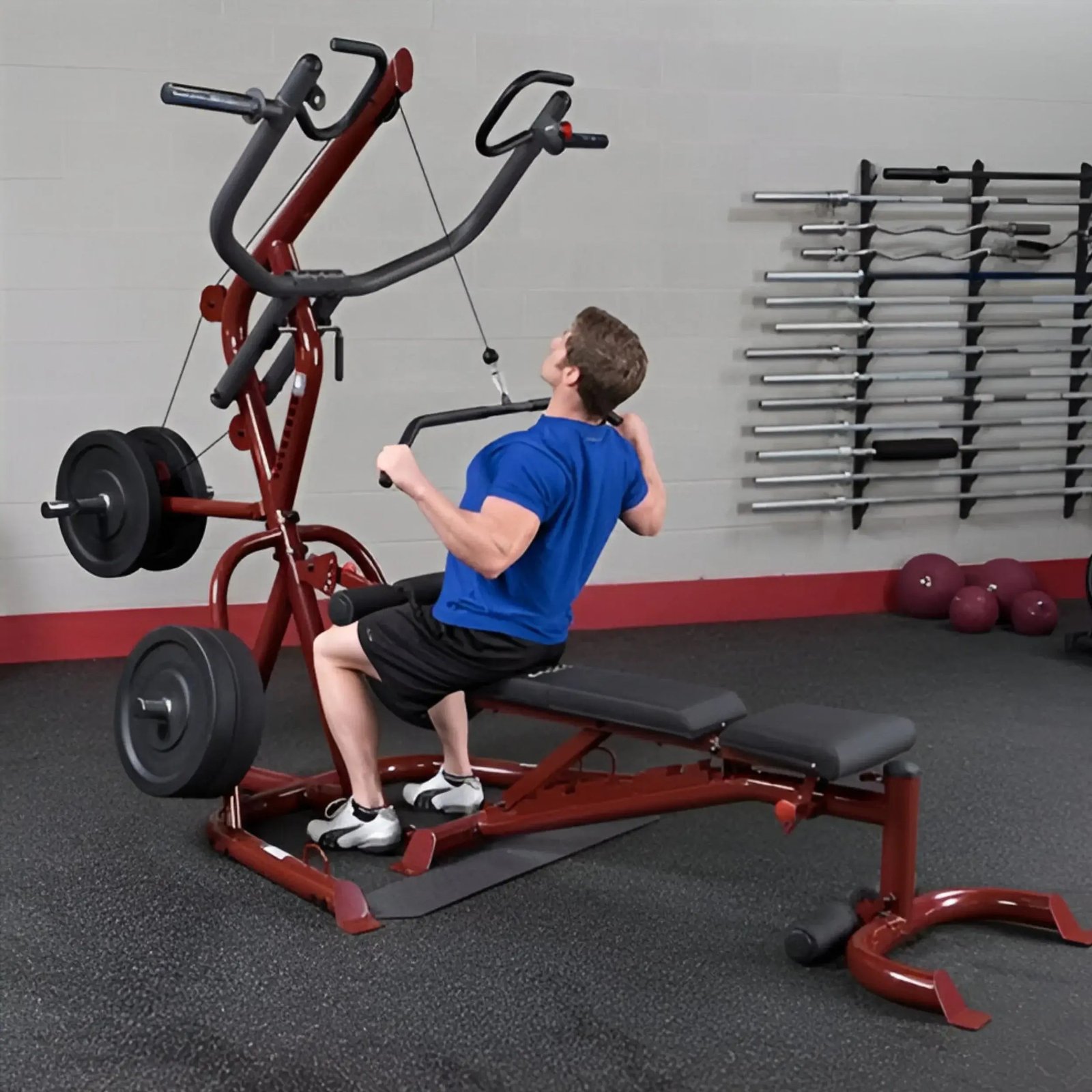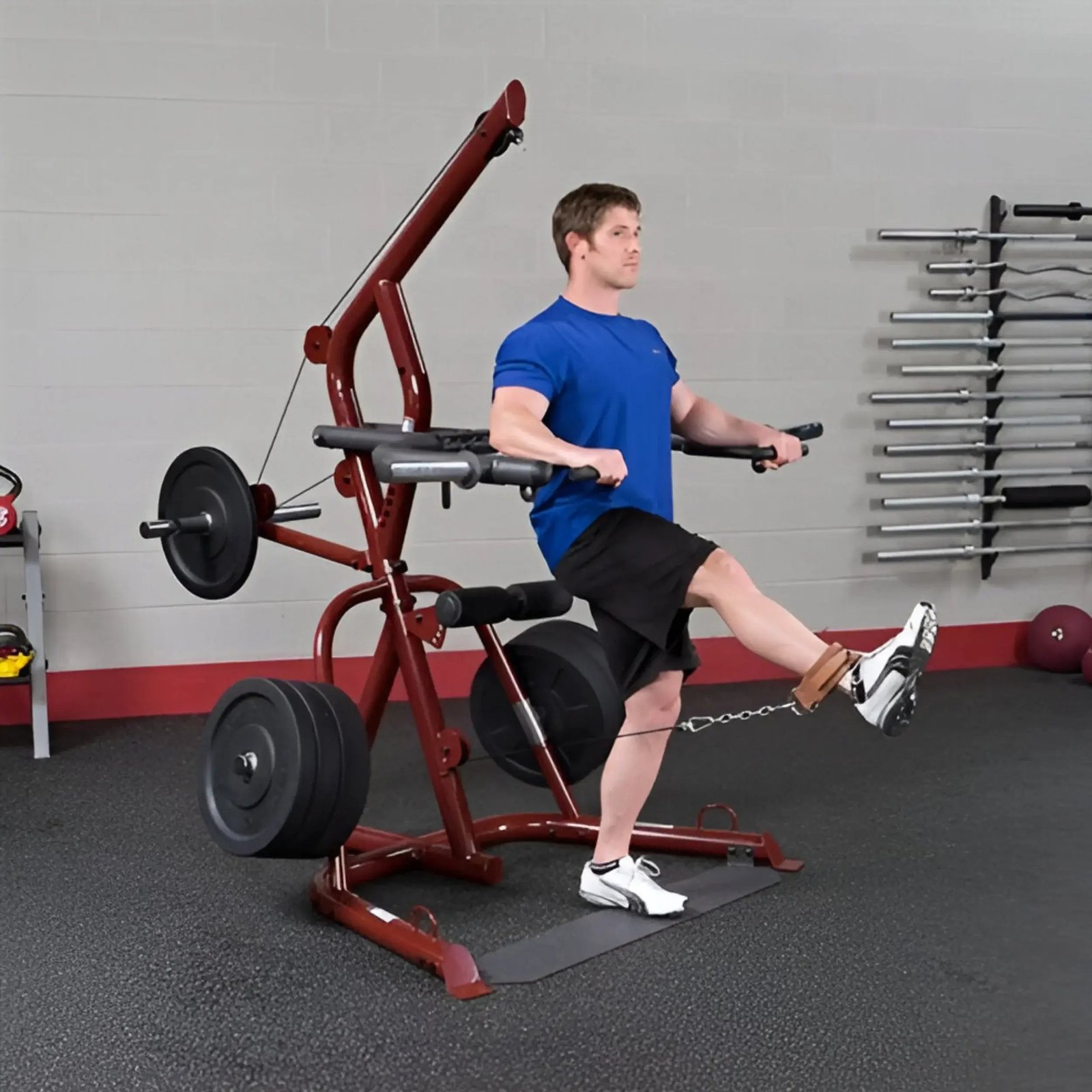 Perform shrugs, squats, dead lifts, biceps curls and everything in-between more easily and effective. With a revolutionary space-saving design the GLGS100 fits comfortably into most home and commercial settings. With an all-new, high-tech/high-gloss anodized red finish, this gym not only stands out for its performance but also its looks.