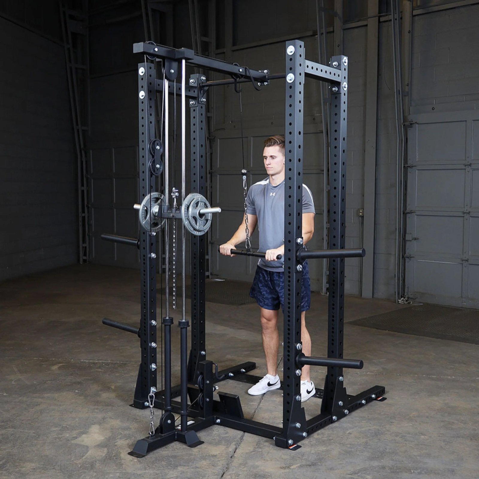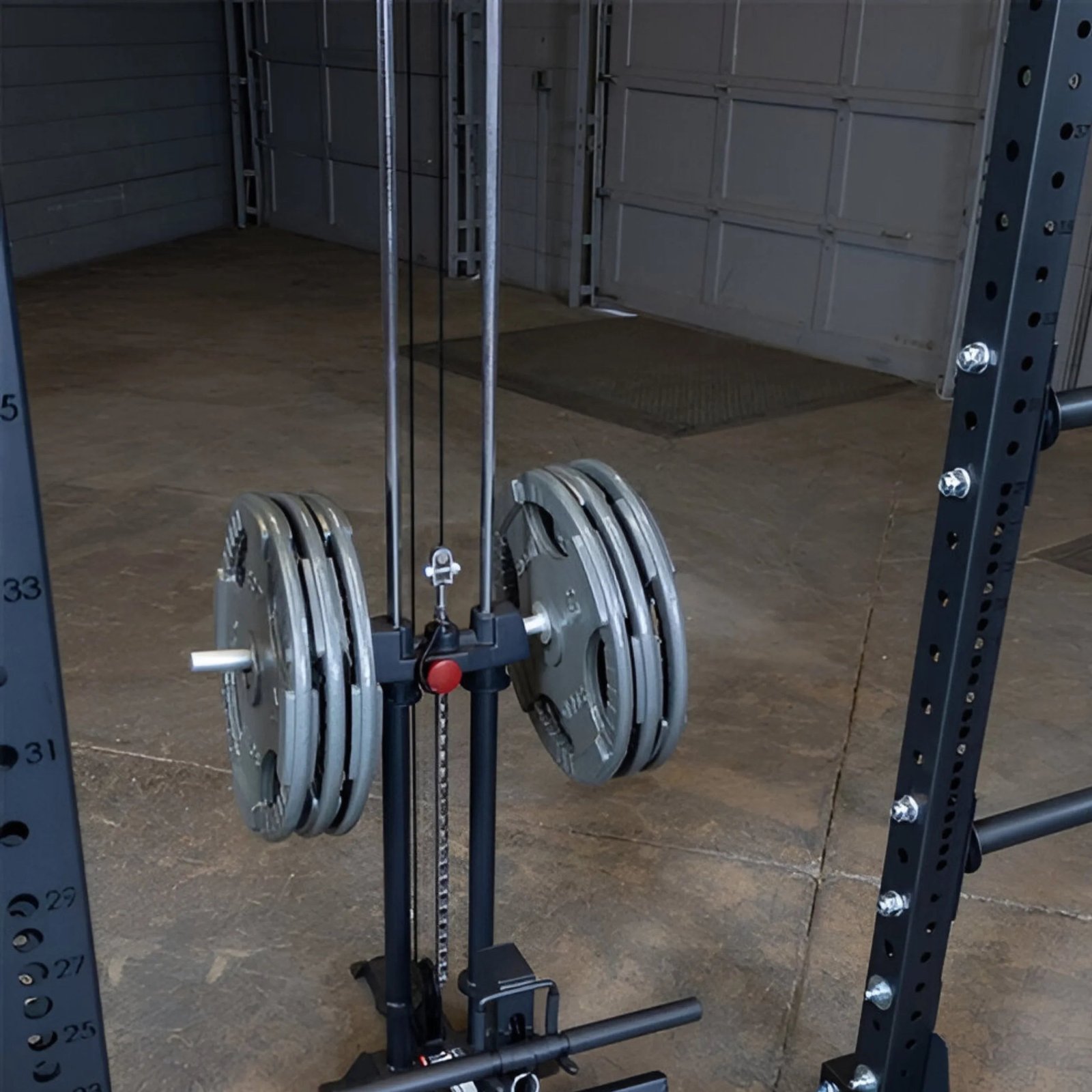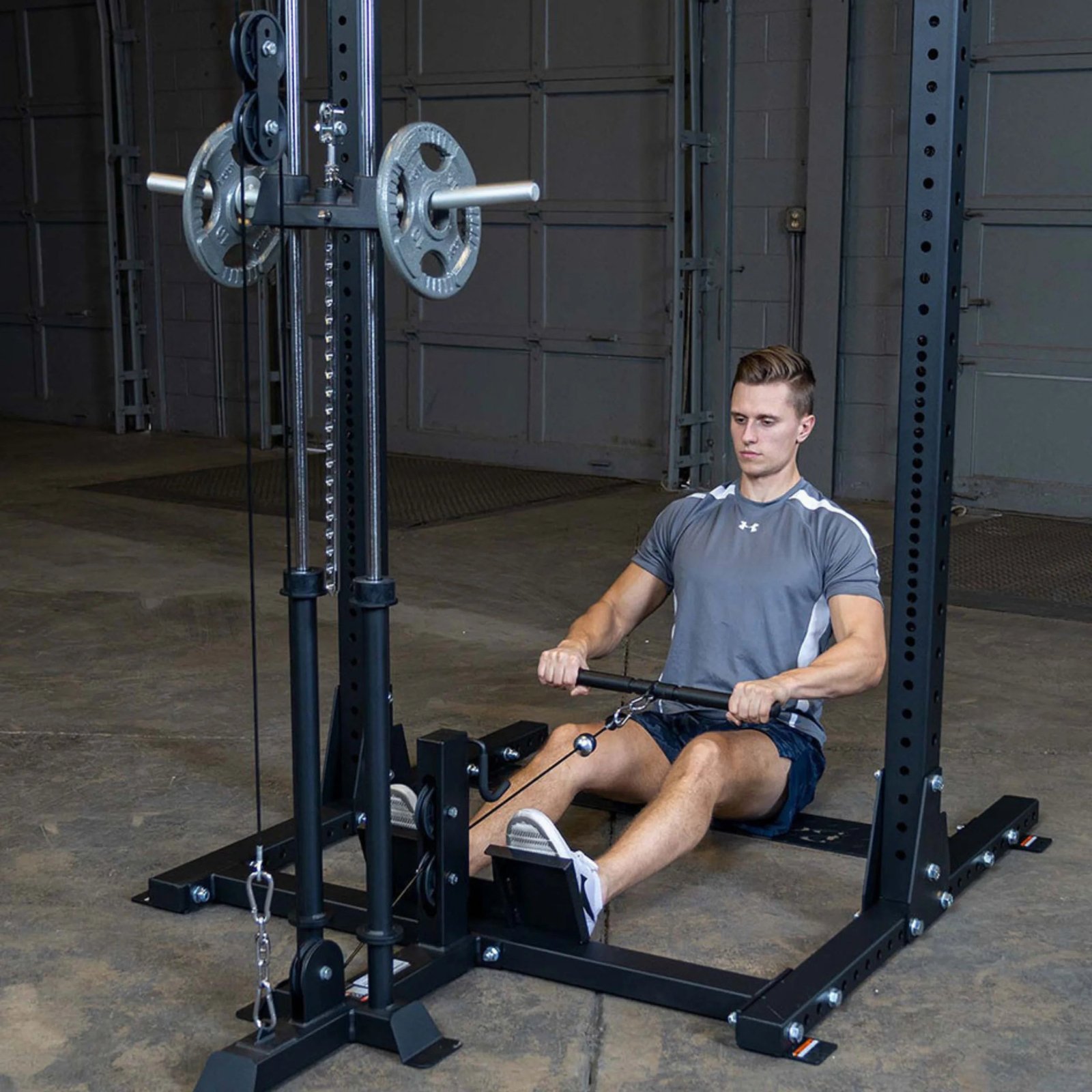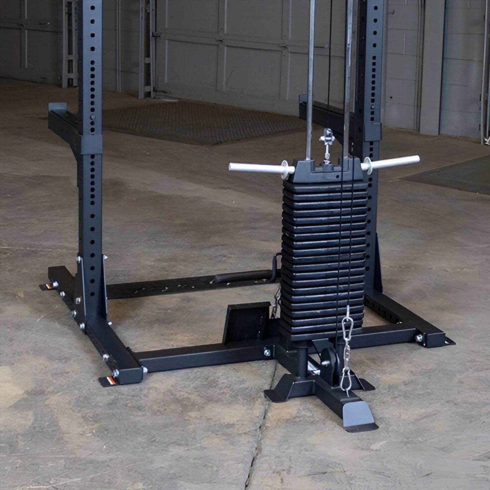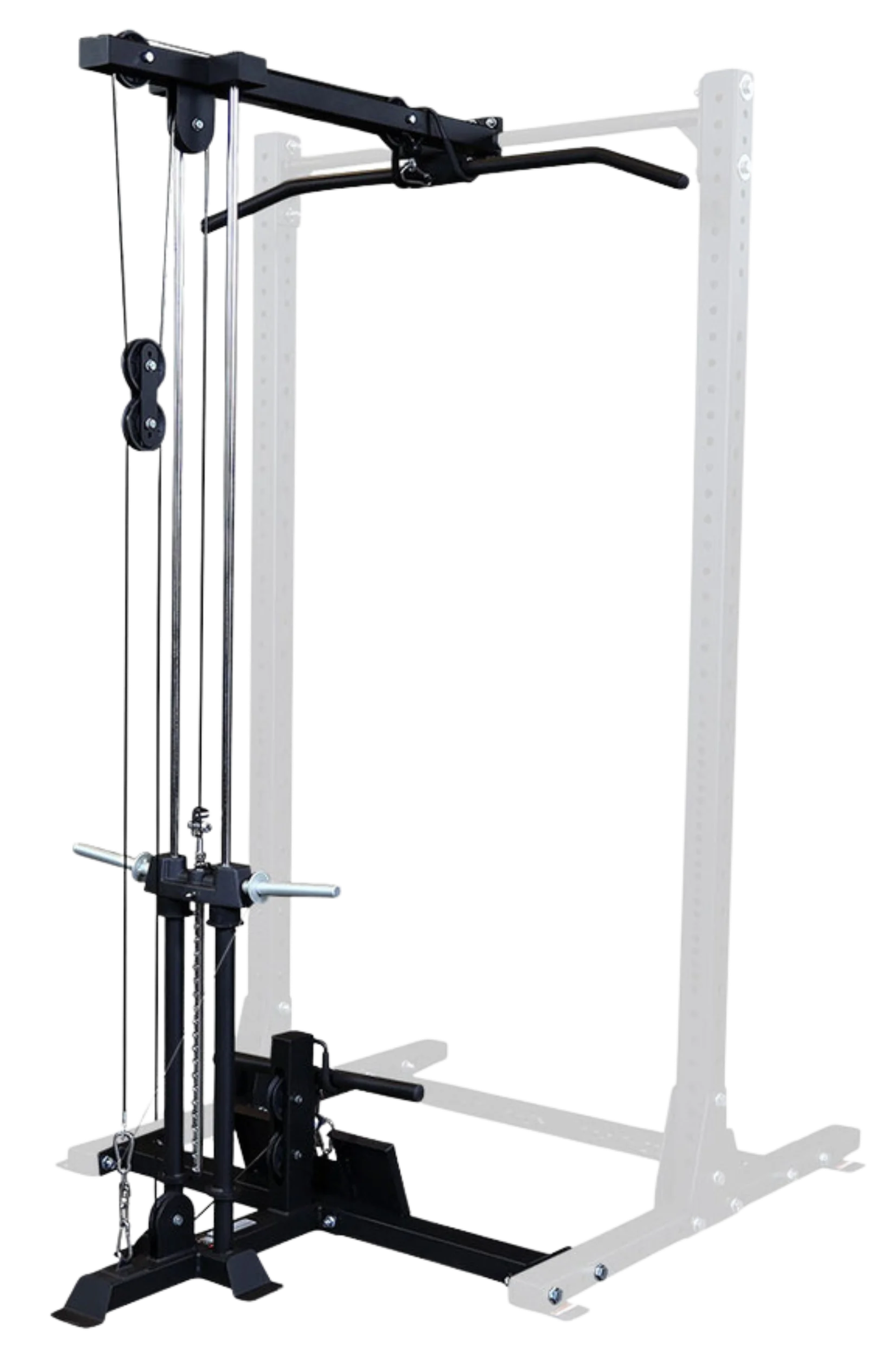 This attachment allows users to perform several high and low pulley exercises on their half rack including lat pulldowns, rows, biceps curls, shrugs, and more.