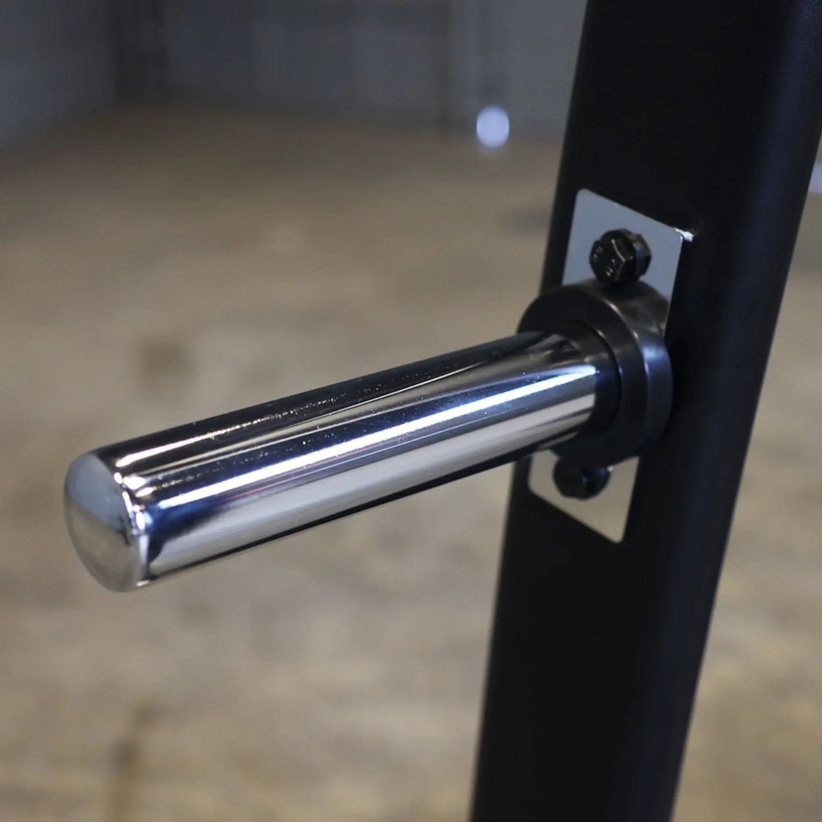 Six Olympic-weight plate storage posts safely suspend plates off the floor for easy access.