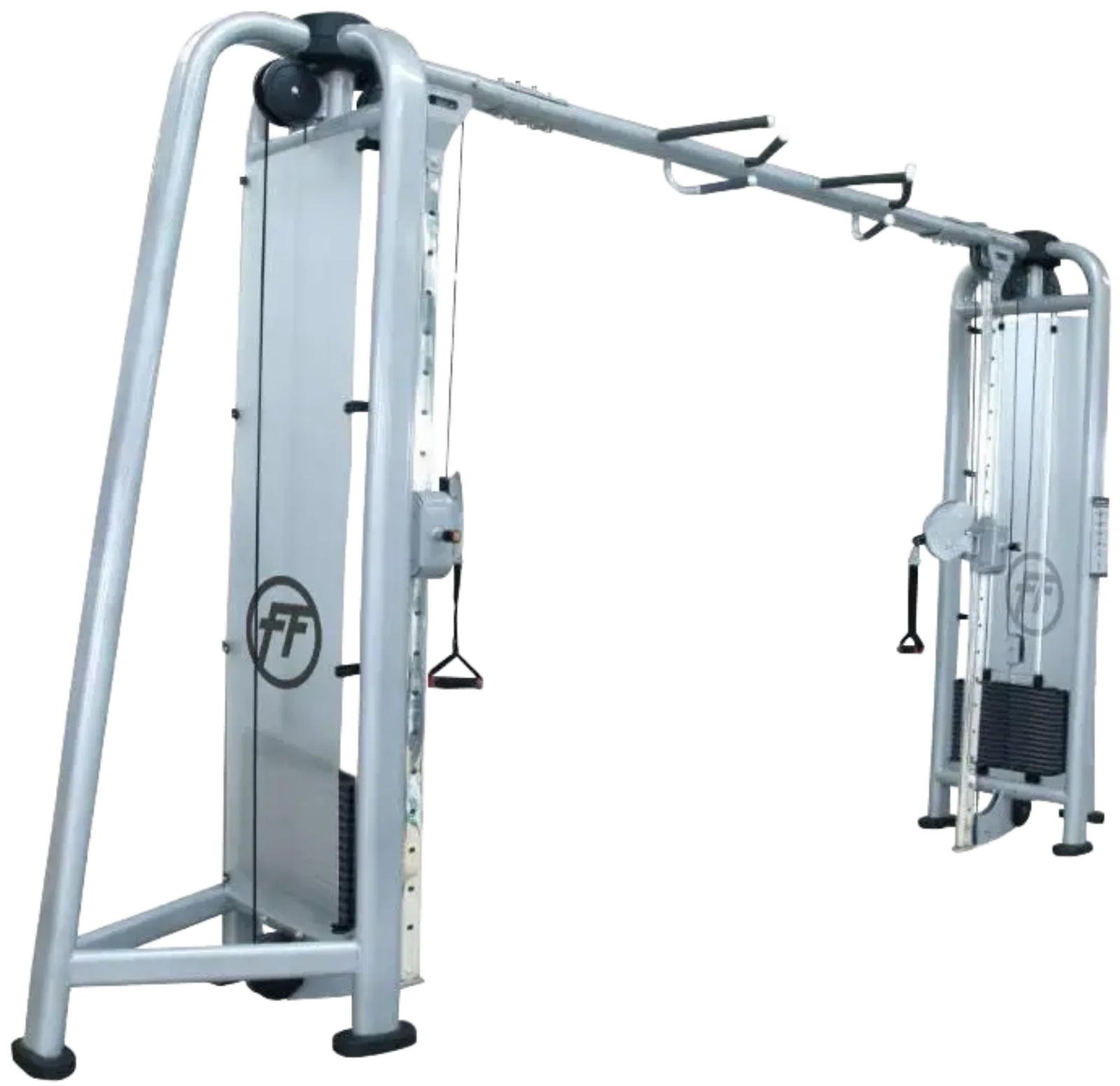 The French Fitness FFS Silver Adjustable Cable Crossover is designed to allow users to work a large number of muscle groups and perform various exercises at one station, increasing space and time efficiency. The grips are supported with aluminum collars, preventing them from slipping during use. The fiberglass-impregnated nylon pulleys increase fluidity allowing ultra-smooth movement and cable response for more effective training.