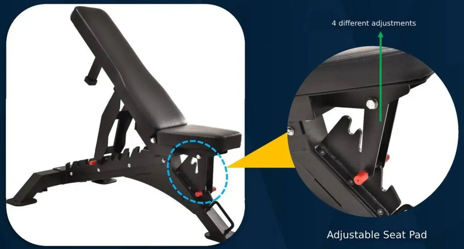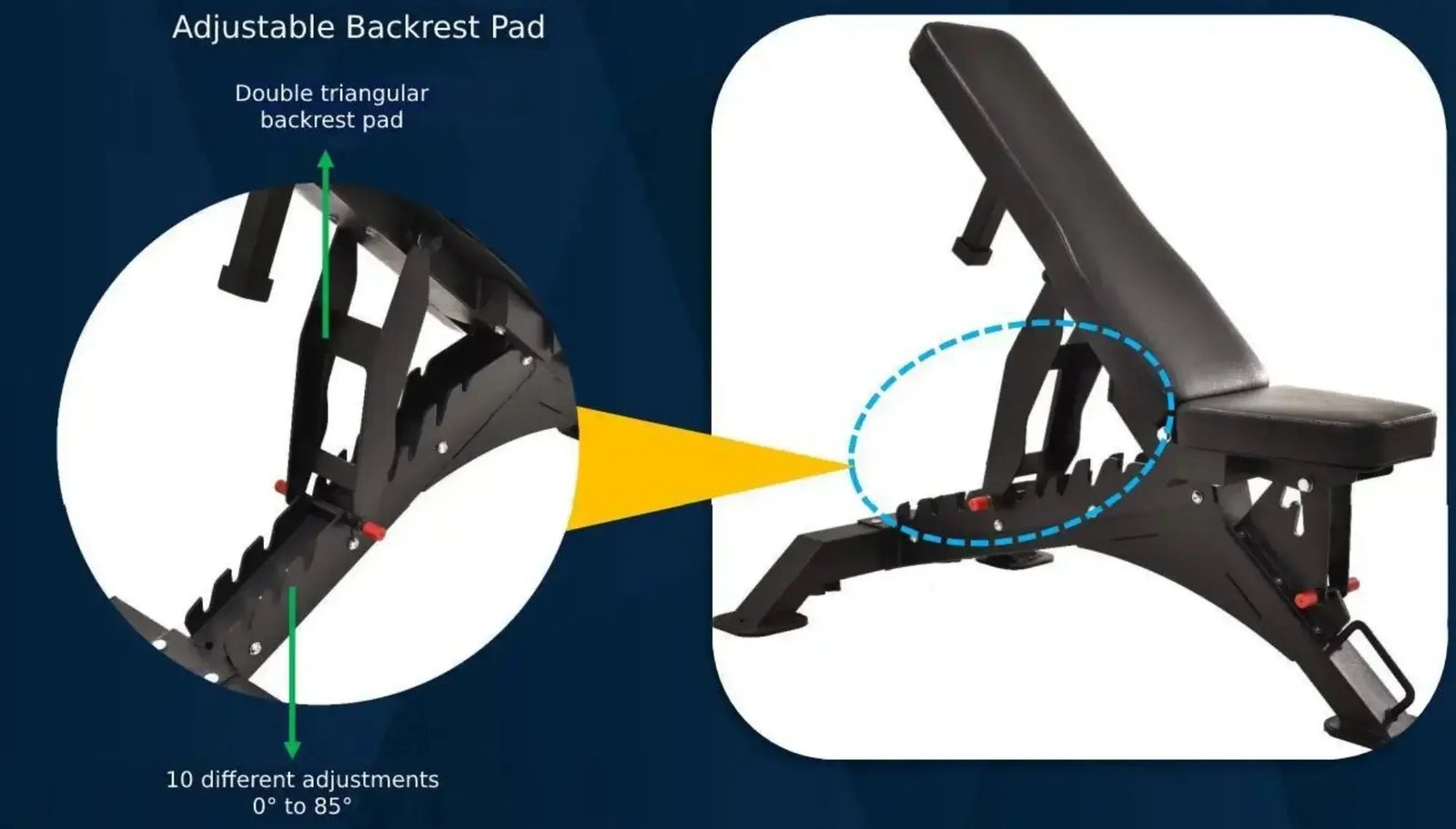 The French Fitness FSR50-AB Adjustable Bench is designed for weight training, both the seat and back pad can be adjusted for different workout needs. The back pad offers 0 to 85 degree adjustability in 10 increments. The seat pad can be rearranged to 10, 20, and 30 degrees to achieve your workout goals.