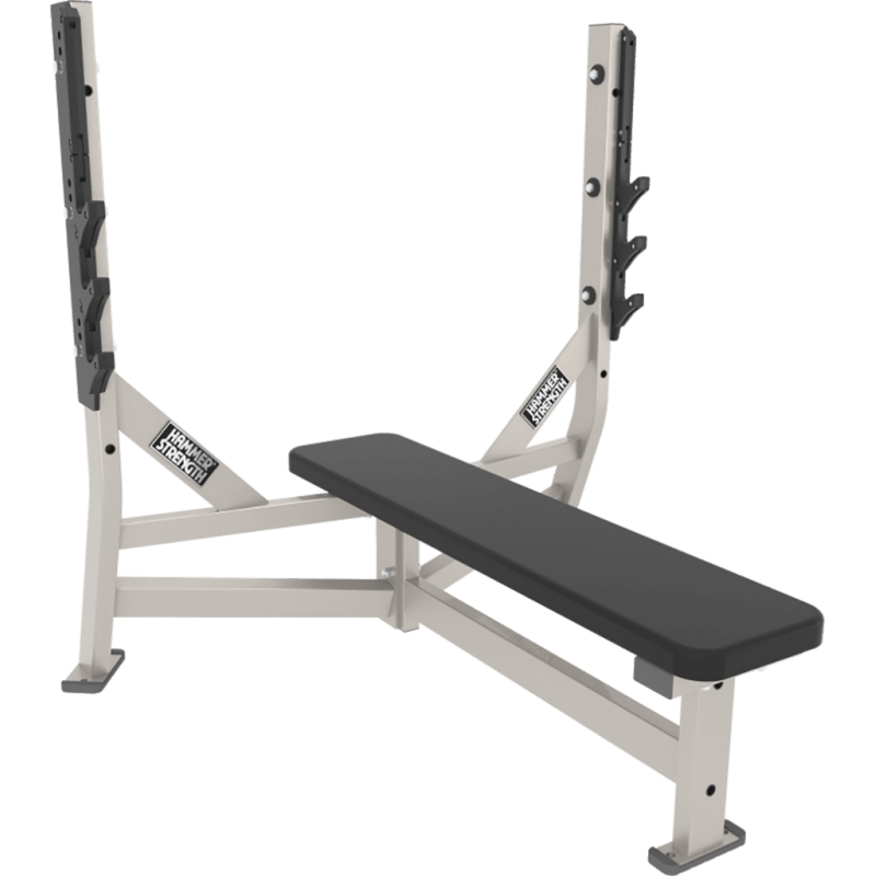 The Hammer Strength Olympic Flat Bench has three Olympic bar racking positions, offering the perfect flat weight bench for strength training at home.